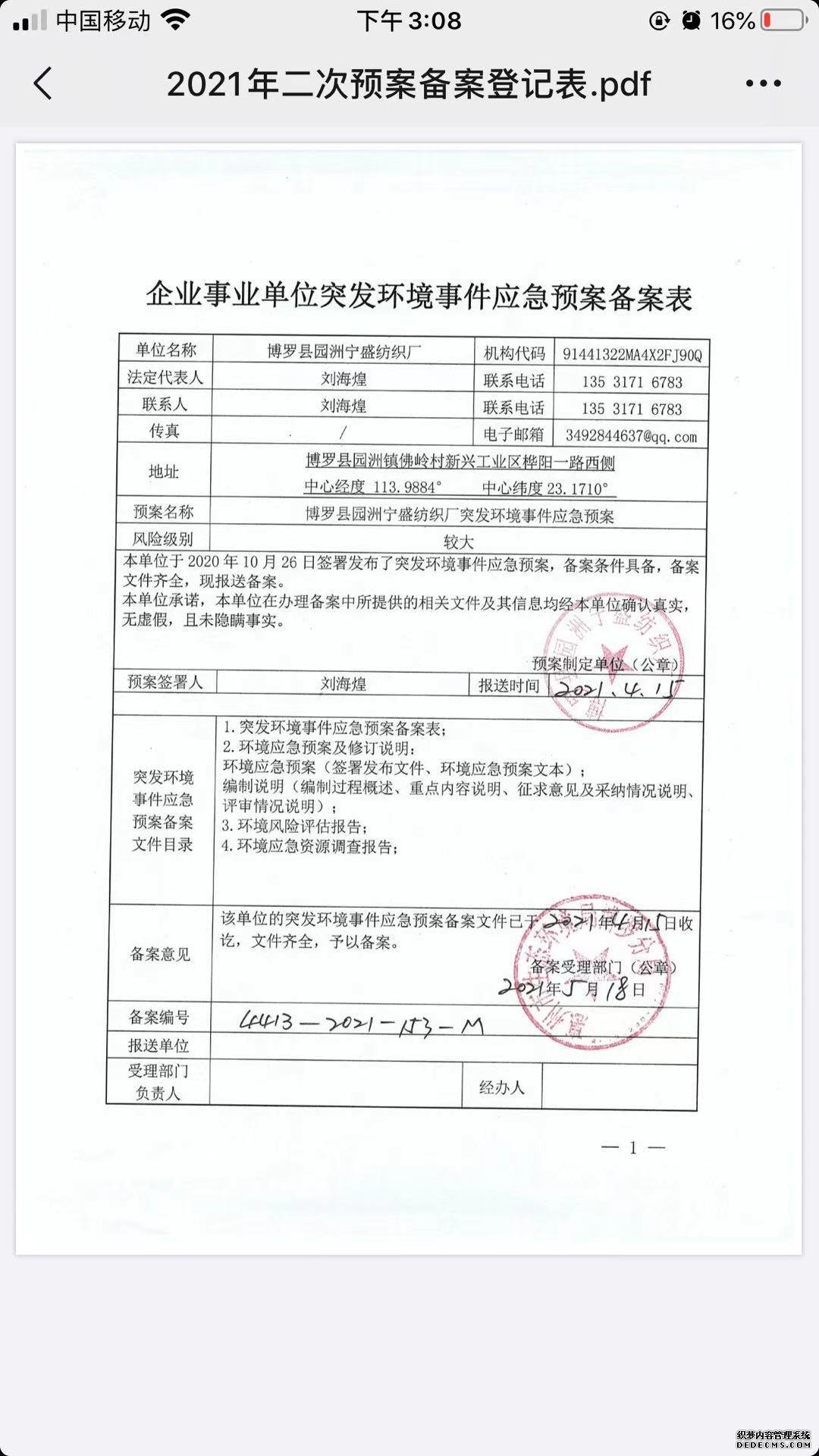 附件鏈接: 《博羅縣園洲寧盛紡織廠突發(fā)環(huán)境事件應急預案備案登記表》 |