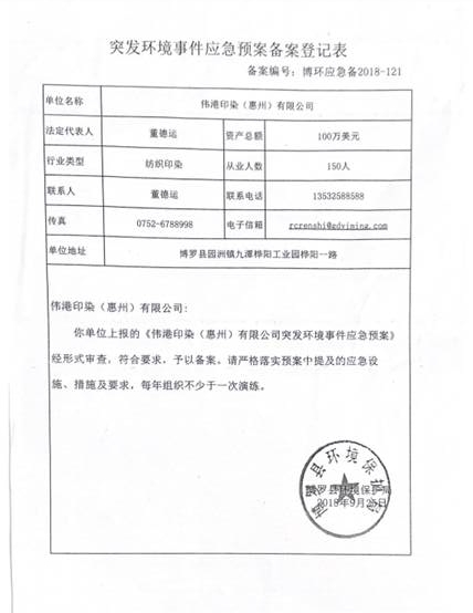 附件:《偉港印染(惠州)有限公司突發(fā)環(huán)境事件應(yīng)急預案備案登記表》 |